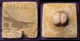 I found this one at a local Afghan dealer in Hamburg. There are some Indus seals depicting a horned deity standing in a tree. The tree always has fig leaves emanating from the branches. The tree (?) on this examle has no leaves, the branches look more like horns. The monkey (?) looks strange too. Note the incrustations.
